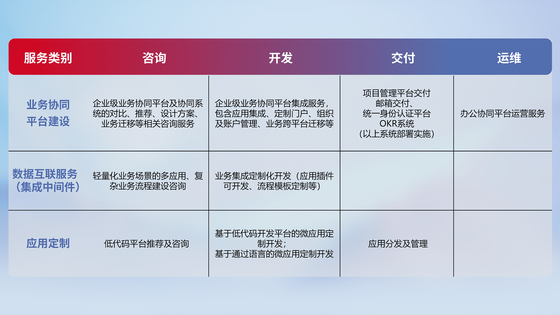 针对钉钉、、、企微、、、、IDaas等平台级产品提供产品的规划、、方案、、、、交付、、、定制化开发等服务,,实现如统一协同办公、、、、智能客户服务、、混合会议管理、、、智能数据查询、、、、等业务场景,,,,实现数字化转型。。。